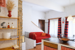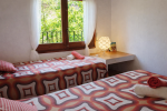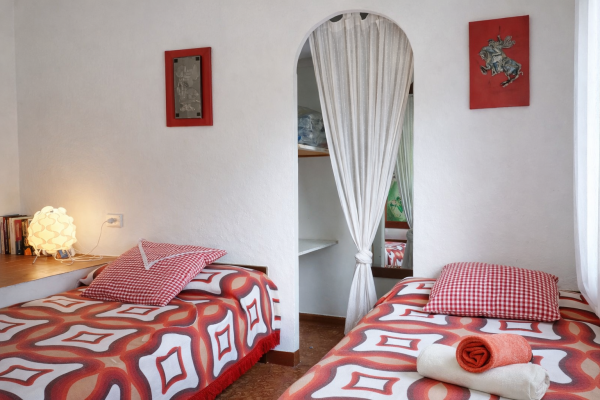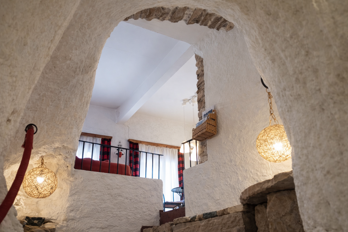 A la planta de dalt, on s’hi arriba pujant unes escales que ressegueixen la roca esculpida, en un espai guanyat a la muntanya, hi ha dues habitacions; una de matrimoni i una altra amb dos llits individuals. En aquesta planta trobem també un bany.