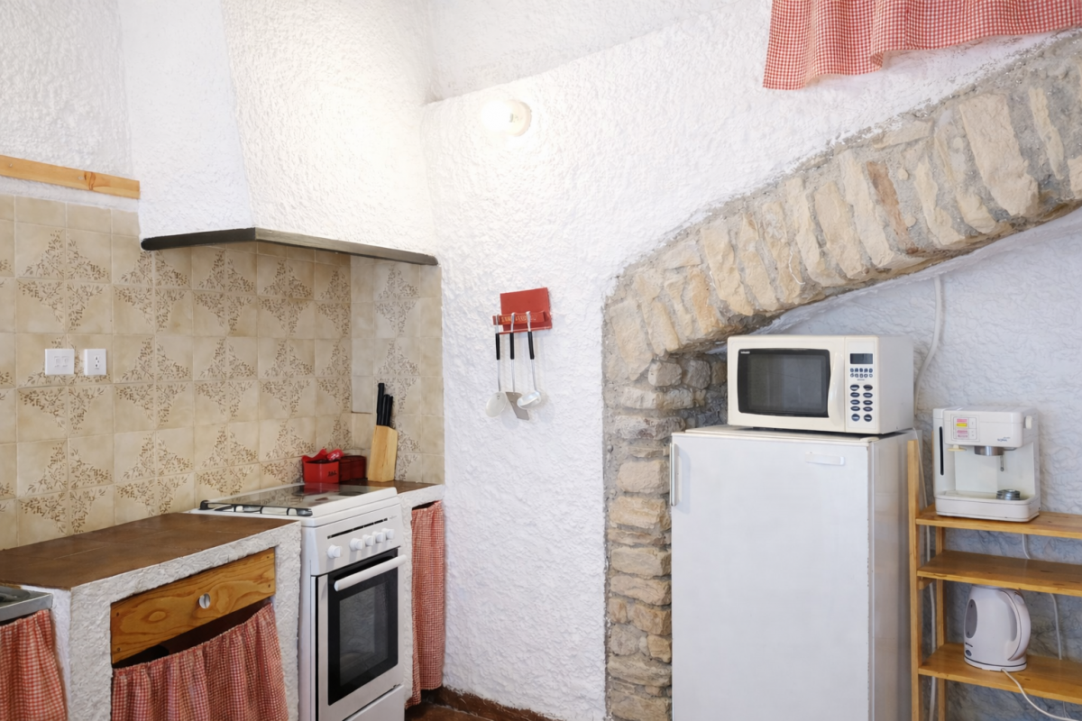 La porta d’entrada a la casa dóna pas al menjador i a una cuina molt àmplia. Baixant unes boniques escales, arribem al petit celler, una cova excavada a la roca que tot sovint acaba sent el lloc protagonista dels jocs i aventures que imaginen els més petits.