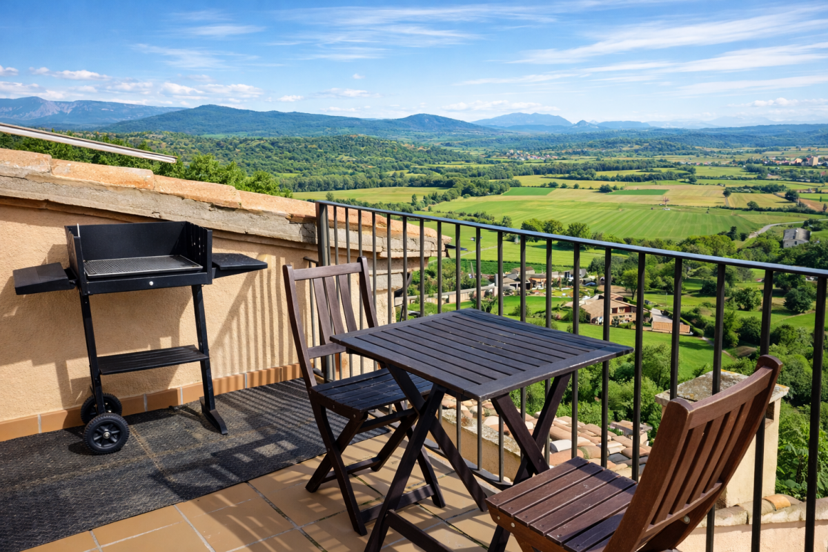 Des de la sala menjador accedim a una habitació doble coronada amb un bonic altell de fusta, aquest altell es un lloc idoni per submergir-se en la lectura i deixar viatjar la imaginació, i permet, a més, la col•locació de 2 llits addicionals. Al costat de l’habitació un bany complert amb banyera i, en front, una sala d’estar amb llar de foc i una terrassa - mirador que ofereix unes vistes meravelloses de la vall -. En aquesta sala hi ha un sofà que és transformable en un confortable llit de matrimoni, quedant, si es vol, la sala d’estar com una habitació de matrimoni amb llar de foc i terrassa.