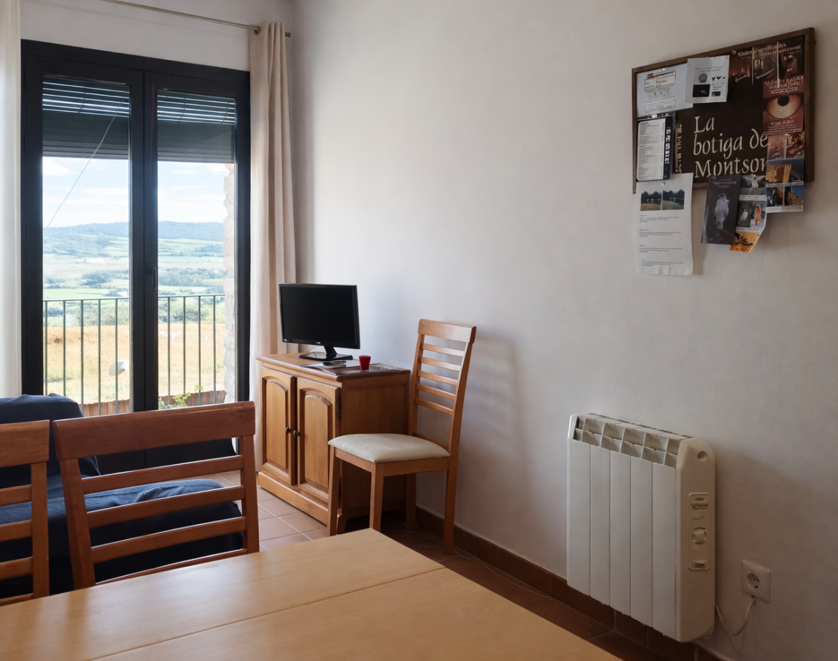 L'allotjament està ubicat a 150 metres del Castell de Montsonís i és ideal per descansar. Disposa de les condicions òptimes per a una estada tranquil•la, fer turisme rural i conèixer la zona. L’apartament és distribueix en una sola planta, espaiós i molt lluminós. La cuina i sala-menjador estan equipades amb tot detall, també hi ha 2 habitacions dobles amb bany particular en cada una d'elles.